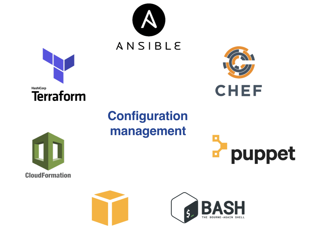 Examples of configuration management tools (AWS CloudFormation, Terraform, Ansible, Chef, Puppet, AWS CLI, Bash)